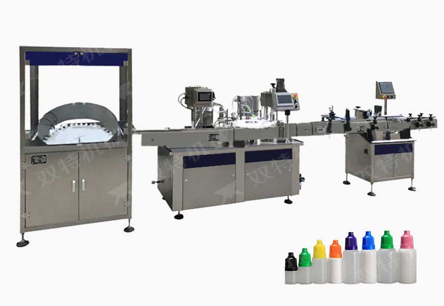 色素塑料圆瓶灌装生产线适用于5-100ml圆形、扁形各种材质的塑料瓶玻璃瓶的电子烟油、滴眼液灌装生产。本机有高精度凸轮分机构提供分度等分盘定位上塞上盖加速度凸轮传动旋盖头升降;恒扭矩旋盖,蠕动泵计量灌装;触摸屏控制,无瓶不灌装;不加内塞、外盖,具有传动平稳、定位精确,计量准操作简单等优点,上内塞、外盖均有专制磨具校政对位合格率高。内塞料斗采用单轨道和双轨道送料,根据用户产量而定。